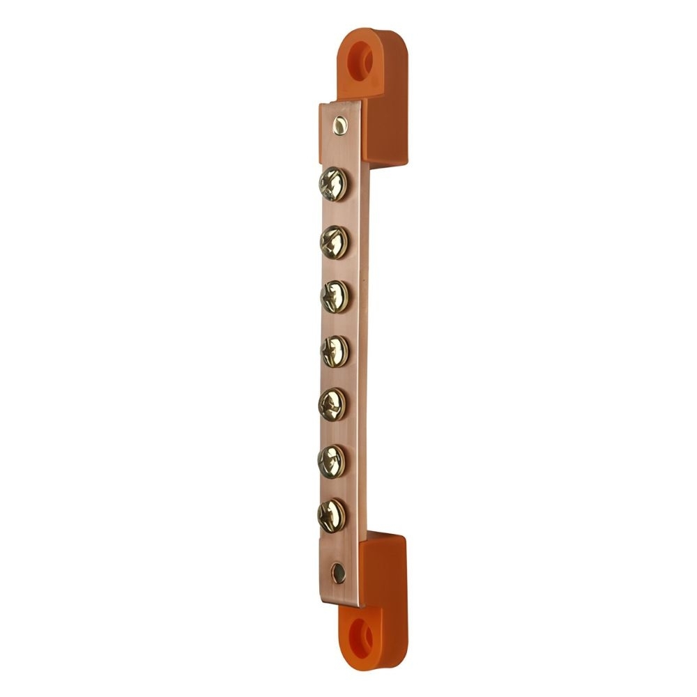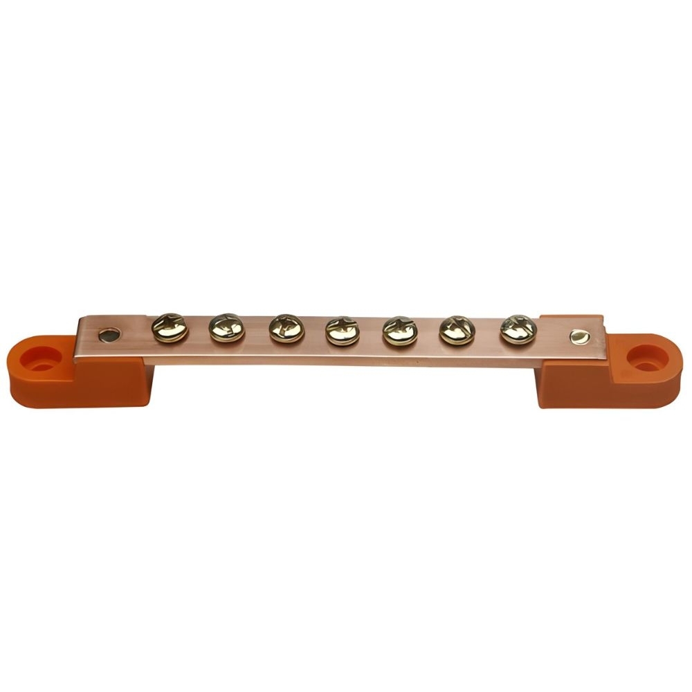Descrição: O barramento neutro ou terra com isoladores laranjas é projetado para uso em quadros de distribuição.