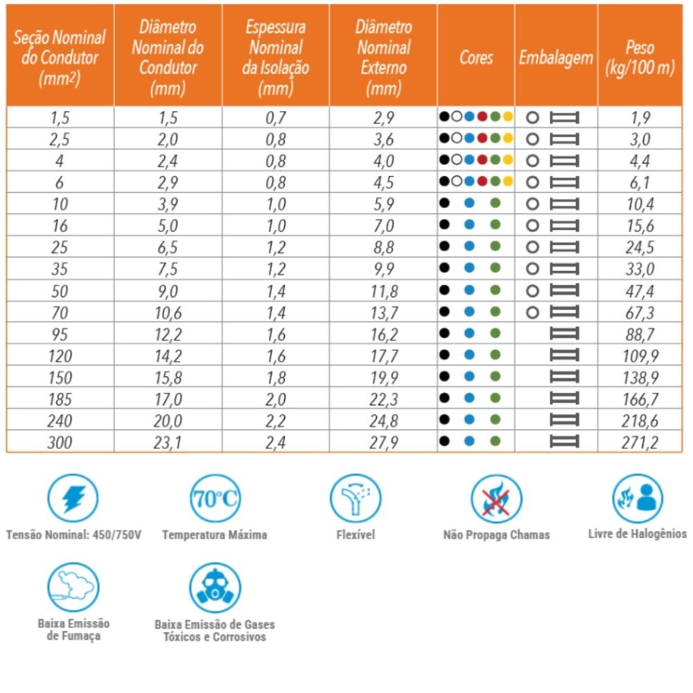 Isolação: Composto termoplástico poliolefínico não halogenado (LSHF/A) com baixa emissão de fumaça e gases tóxicos em caso de incêndio.
