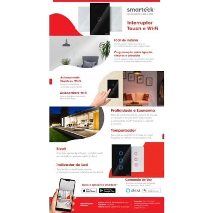 O interruptor Smarteck Touch com 2 módulos é mais um produto com a qualidade da STECK. Empresa que a mais de 40 anos é líder no fornecimento elétrico A linha possui mais de 15 produtos controlados por único aplicativo, para que você tenha o controle de tudo na palma de suas mãos Confeccionada em vidro temperado e com luz de LED no painel, ela alia design e tecnologia em um só produto É fácil de instalar e traz diversos beneficios: acionamento touch, temporizador, acionamento wi-fi e remoto, monitoramento de consumo de energia, bivolt e ainda possui acionamento por comando de voz com a Alexa da Amazon e pelo Google Assistente Todos os produtos STECK passam pelos mais rigoroso testes de segurança e qualidade, e os produtos Smarteck são todos com certificação modular da ANATEL garantindo a segurança para as residências brasileiras.