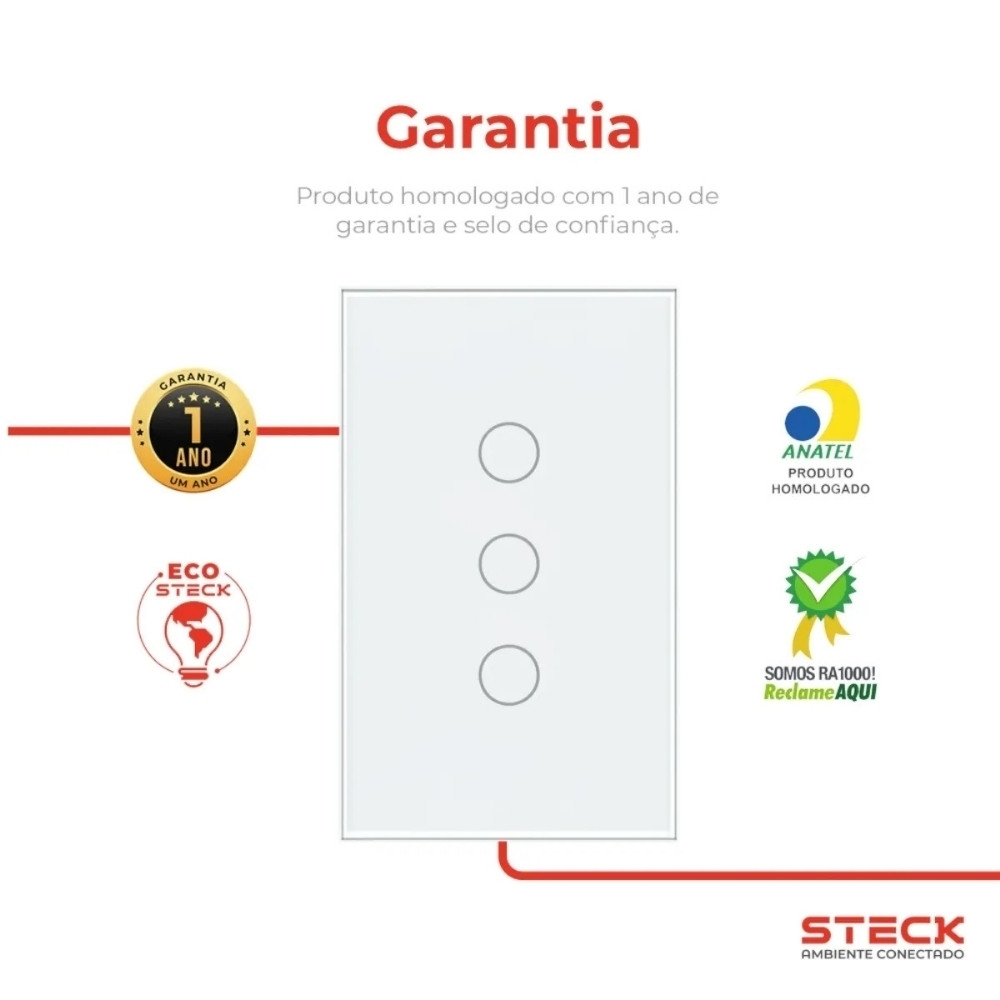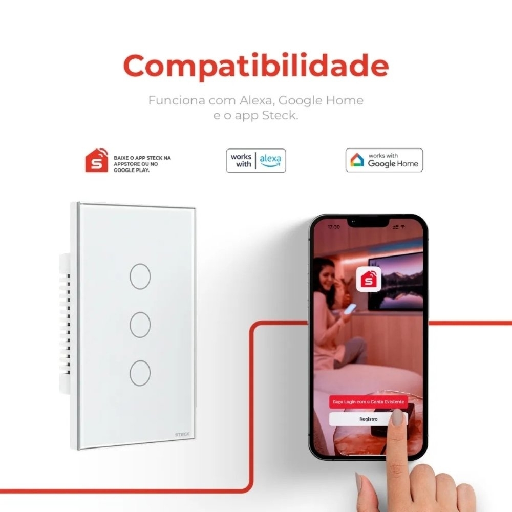 O Conjunto 4x2 com 3 interruptores touch Wi-Fi da linha Ambiente Conectado Steck é a solução ideal para automação residencial moderna, permitindo controlar a iluminação pelo smartphone, comandos de voz ou diretamente pelo painel sensível ao toque. Compatível com lâmpadas convencionais, transforma qualquer ambiente em uma casa inteligente sem necessidade de central de automação ou gateway adicional.