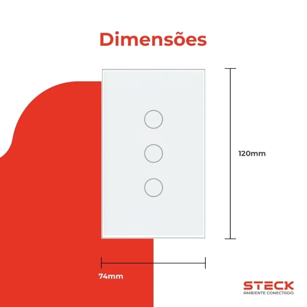 Com acabamento sofisticado em vidro temperado e moldura em ABS, possui botões touchscreen de alta sensibilidade com LEDs indicadores que mostram o status da iluminação, proporcionando praticidade mesmo no escuro. A comunicação ocorre via Wi-Fi, permitindo integração total com outros dispositivos da linha Steck Ambiente Conectado, sendo indicado tanto para aplicações residenciais quanto profissionais.