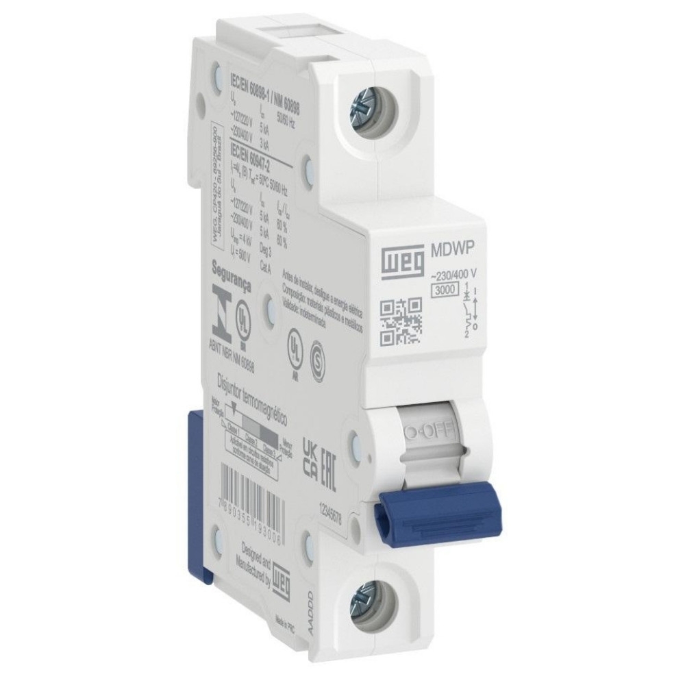 O Disjuntor DIN WEG 1P 4A Curva C é ideal para proteção de circuitos elétricos contra sobrecarga e curto-circuito, oferecendo segurança e confiabilidade, especialmente em circuitos de baixa corrente.
