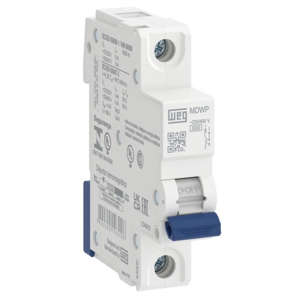O Disjuntor DIN WEG 1P 63A Curva C é ideal para proteção de circuitos elétricos contra sobrecarga e curto-circuito, oferecendo segurança e confiabilidade para instalações residenciais, comerciais e industriais.
