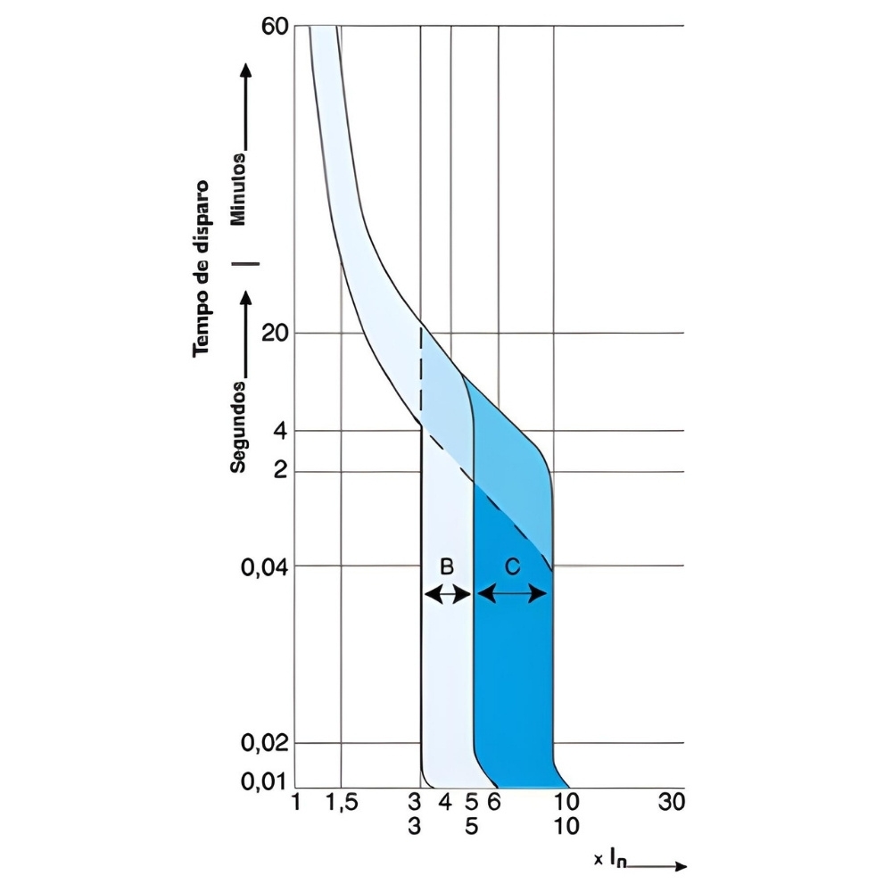 Com curva de disparo tipo C, é recomendado para circuitos com cargas indutivas, garantindo atuação rápida em correntes entre 5 a 10 vezes a corrente nominal.