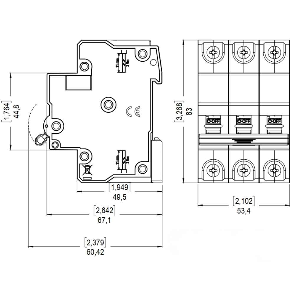 Com disparo instantâneo entre 5 a 10 vezes a corrente nominal, o disjuntor atua de forma precisa na proteção do sistema. Possui corrente nominal de 63A e 3 polos, sendo indicado para sistemas trifásicos, operando com tensão de até 400V em corrente alternada e frequência de 50/60 Hz.