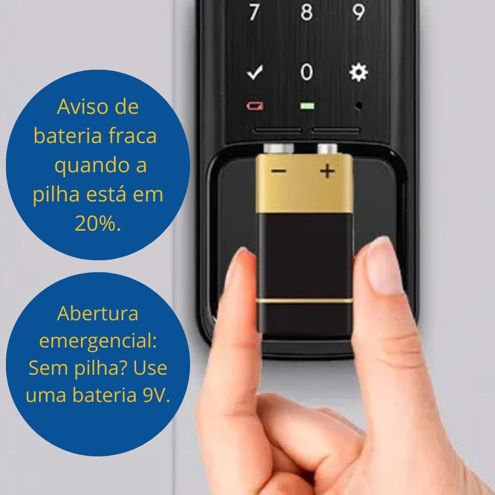 Entrada de emergência para bateria 9V, permitindo abrir a porta caso as pilhas se esgotem.