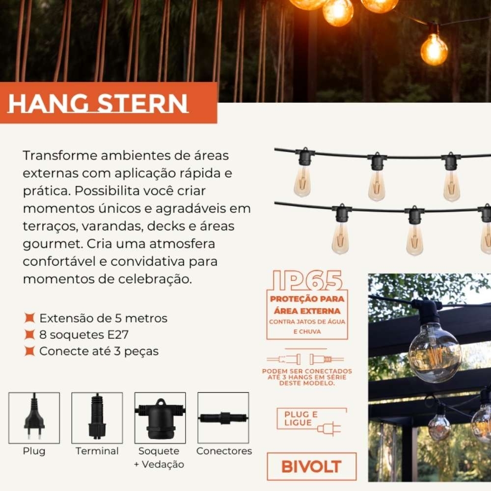 O varal de luz Hang Stern da linha Germany, da Blumenau Iluminação, é a escolha perfeita para quem deseja unir decoração e funcionalidade em ambientes externos. Com 5 metros de extensão e 8 soquetes E27, o festão decorativo oferece versatilidade para personalizar a iluminação com lâmpadas da sua preferência, transformando varandas, decks, jardins e áreas gourmet em espaços ainda mais acolhedores e charmosos.