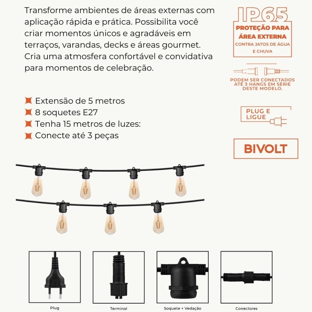 Projetado para uso ao ar livre, o varal de luz possui grau de proteção IP65, garantindo resistência à poeira e jatos de água. Seu sistema de conexão permite o acoplamento de até 3 varais consecutivos, alcançando 15 metros de iluminação contínua, ideal para eventos, celebrações e momentos especiais.