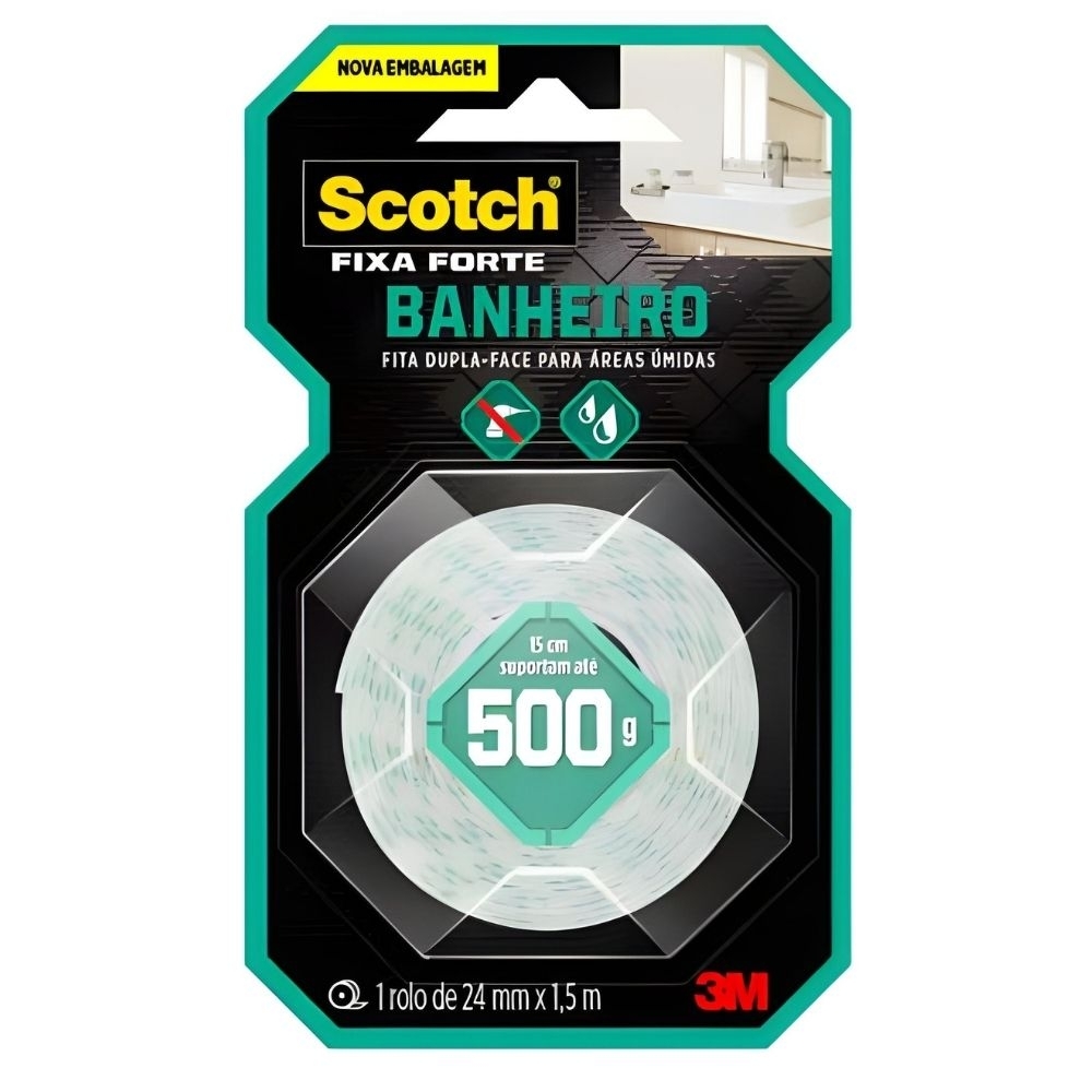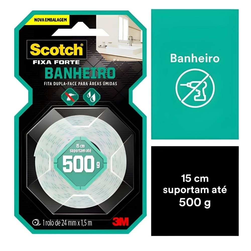 A Fita Dupla Face 3M Scotch® Fixa Forte Banheiro 24mm x 1,5m é a solução prática e segura para fixação permanente em ambientes úmidos. Desenvolvida especialmente para banheiros, ela garante alta resistência e durabilidade, suportando até 500 g a cada 15 cm de fita aplicada. Com ela, você substitui pregos e parafusos, evitando perfurações em superfícies e riscos de danificar canos ou revestimentos.