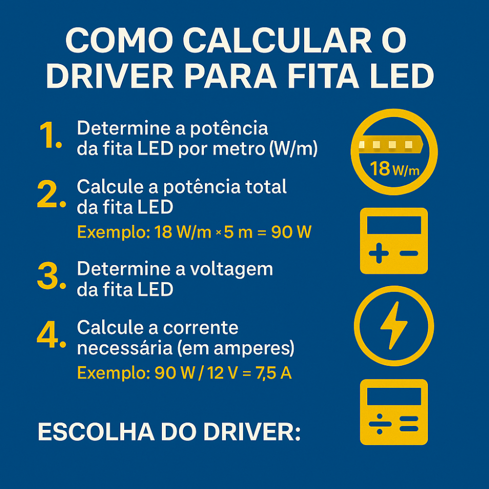 Para garantir o funcionamento adequado da sua fita LED, é essencial calcular corretamente o driver necessário. Aqui está um guia claro para ajudá-lo: