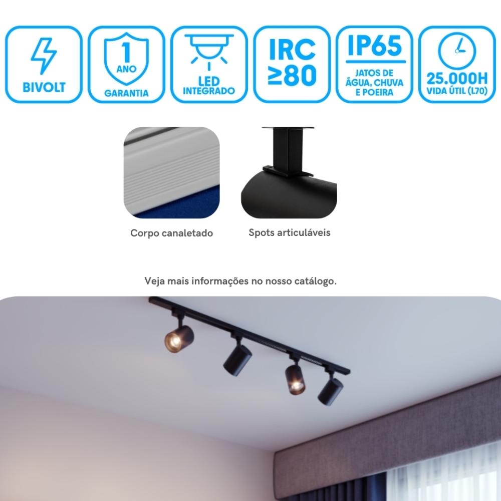 Benefícios do produto: iluminação personalizável com spots direcionáveis, instalação simples com kit incluso, design moderno e minimalista, economia de energia com tecnologia LED integrada, ideal para projetos que exigem estética, eficiência e adaptabilidade em um só produto.