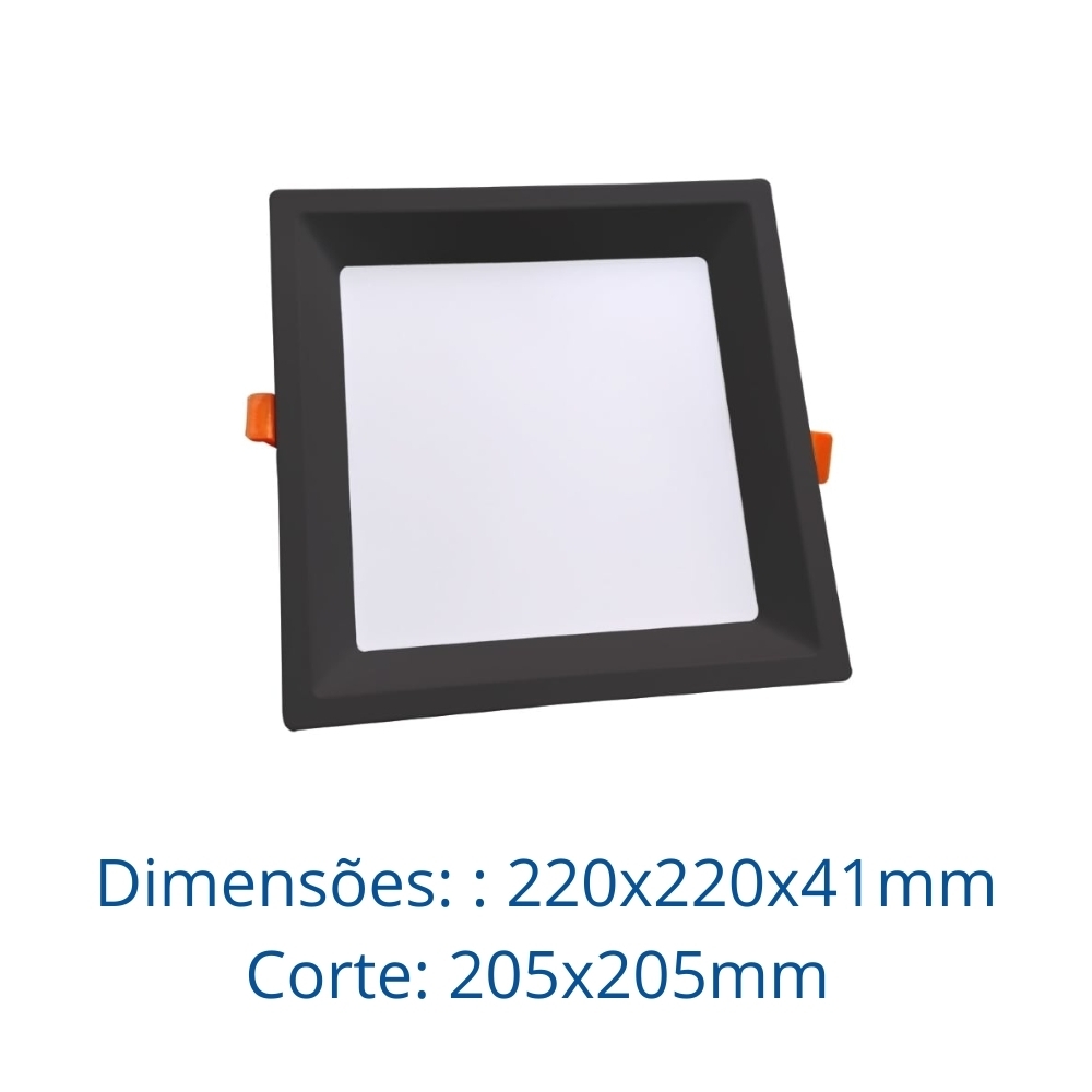 Design moderno e funcional: A estrutura quadrada com acabamento preto fosco e aplicação recuada proporciona um visual clean e contemporâneo, além de conforto visual por reduzir o ofuscamento.