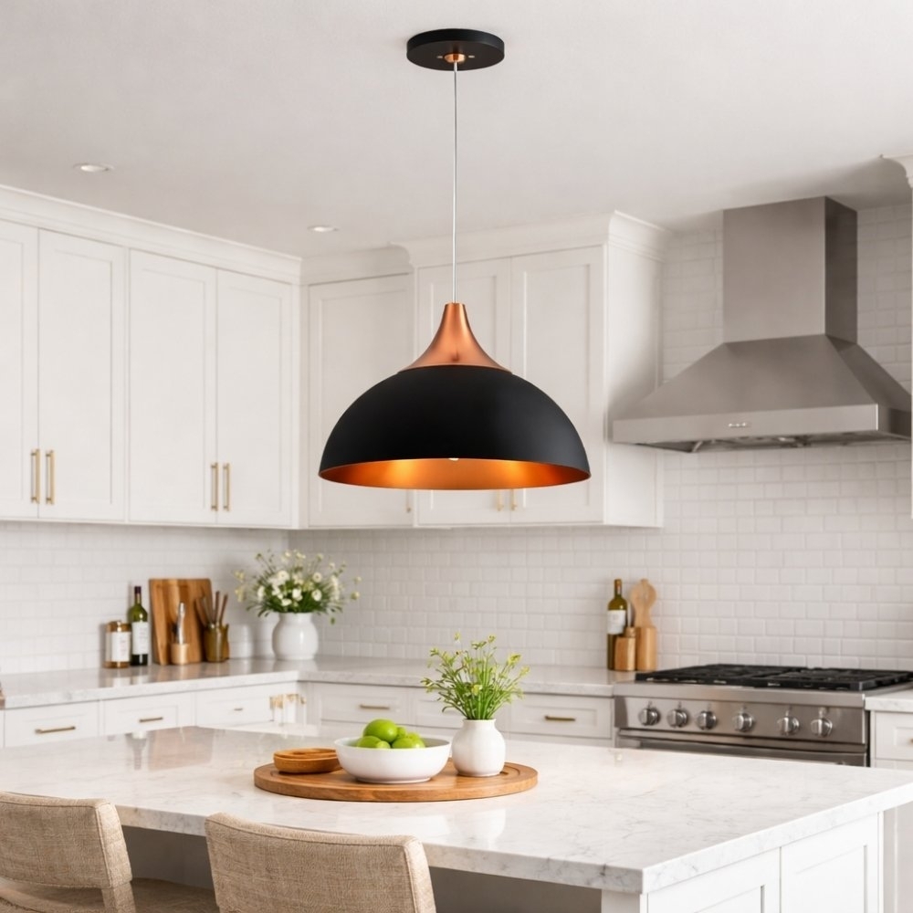 Projetado para comportar 1 lâmpada de base E27 de potência máxima de 60W, o Pendente Decorativo Cuba é a peça ideal para sua casa. Com a mistura das cores preto e cobre, o Pendente traz iluminação, charme e bem estar.
