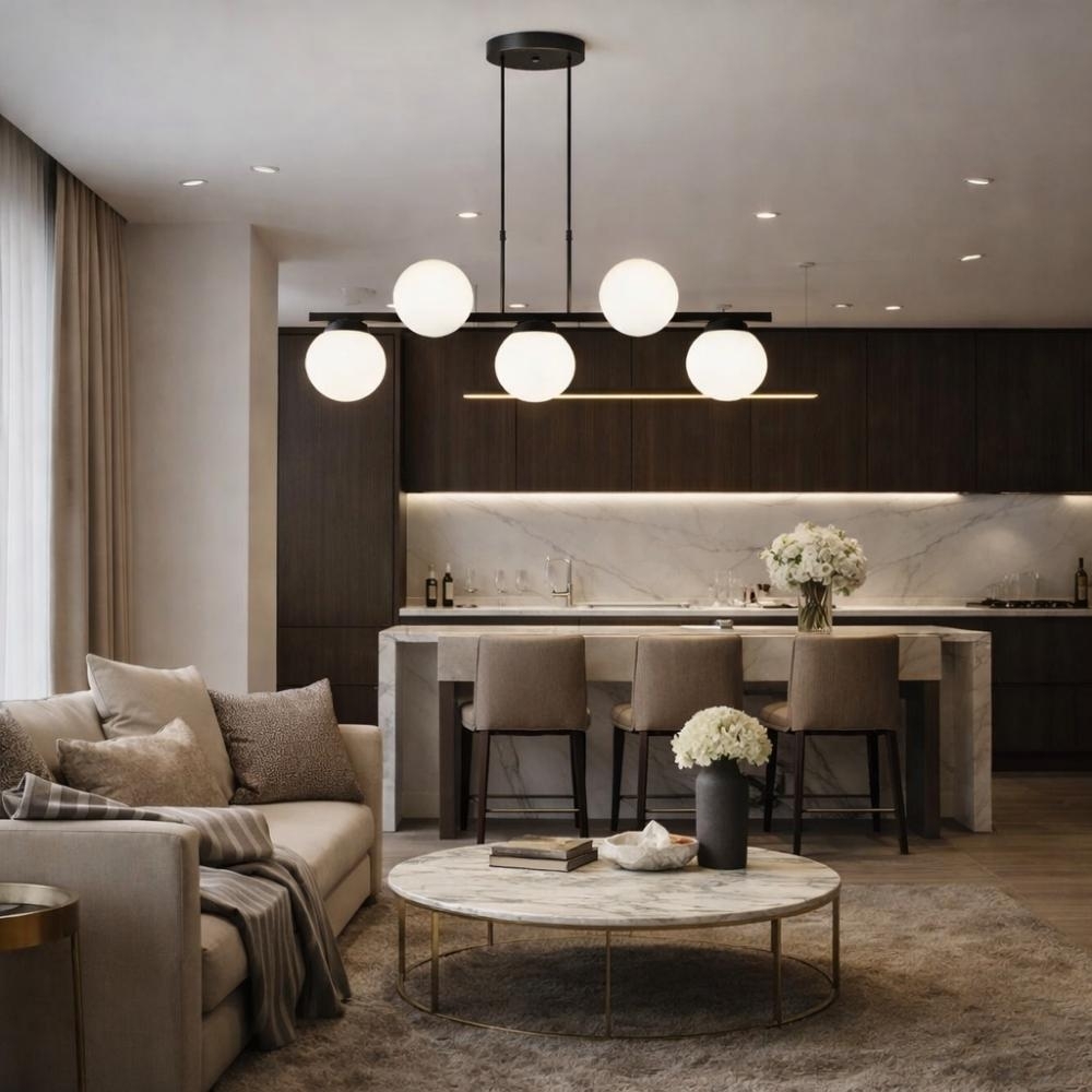 O pendente Hanover é uma luminária decorativa ideal para salas de jantar, cozinhas, áreas gourmet e ambientes integrados, unindo design moderno com acabamento preto e globos em vidro que proporcionam iluminação elegante e equilibrada. Seu formato linear com cinco pontos de luz valoriza a decoração e cria um destaque sofisticado no ambiente.