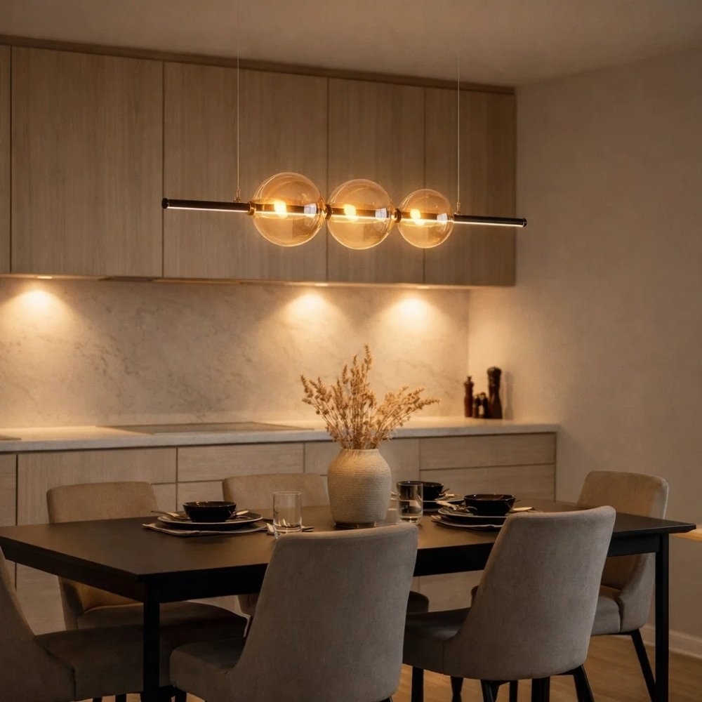 Com 120 cm de comprimento e cabo de 2 metros, oferece flexibilidade de instalação em diferentes ambientes, seja em salas de jantar, estar ou espaços comerciais. O LED integrado de 25W emite 2000 lúmens de luz amarela (3000K), garantindo iluminação suave e acolhedora, perfeita para valorizar a decoração.