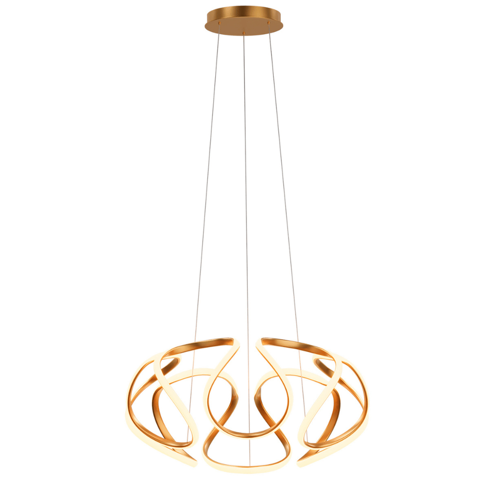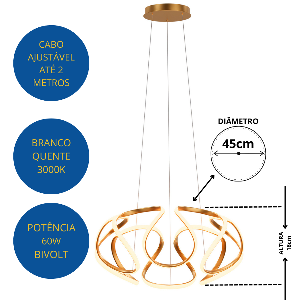 O design do Pendente Horizon é uma fusão de estilo e durabilidade. Ele é fabricado com materiais de alta qualidade, como alumínio, aço carbono e PVC, garantindo robustez e resistência a longo prazo. O acabamento dourado (Gold) acrescenta um toque de luxo ao seu espaço, tornando este pendente um destaque visual em qualquer ambiente.