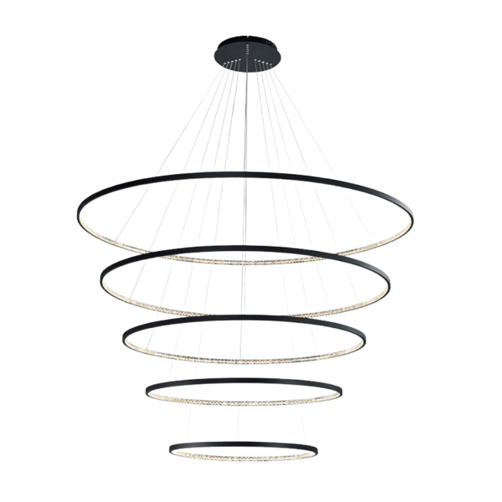 O Pendente LED Milano da Hevvy é uma peça de iluminação que combina potência e design moderno, perfeito para quem busca uma iluminação eficiente e um toque de sofisticação em qualquer ambiente. Com acabamento preto, este pendente LED com 5 anéis é ideal para adicionar um elemento contemporâneo e elegante ao seu espaço.