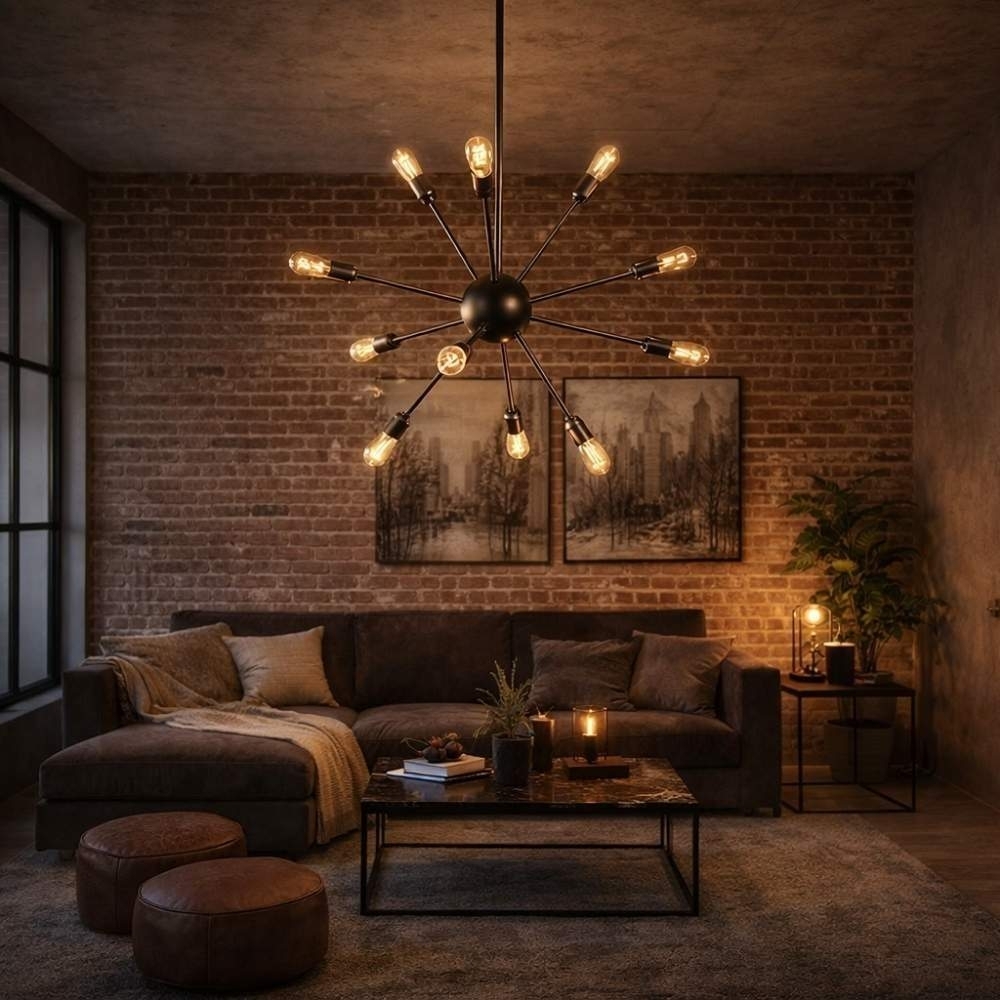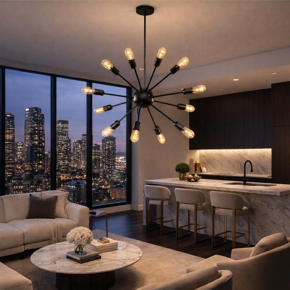 Projetado para 12 lâmpadas com base E27 (não inclusas), proporciona uma iluminação ampla e intensa, além de permitir personalização com lâmpadas decorativas, como filamento ou LED, criando diferentes efeitos de luz.