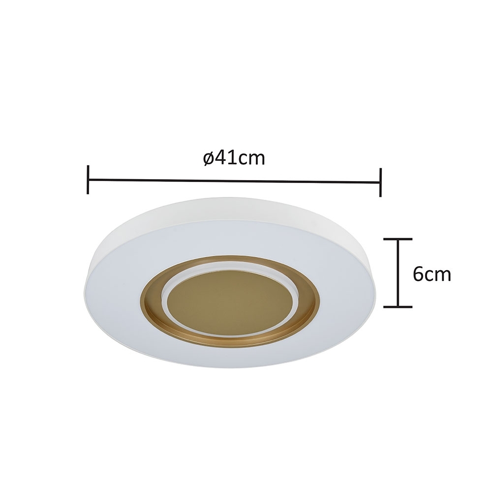 Plafon Montana, acabamento preto com dourado, modelo redondo com 41cm, LED integrado, composto por metal e policarbonato, clean com formas delicadas, elegante e moderno é indicado para sobrepor. Com 3 cores de luz, ao apagar e acender o interruptor você escolhe a cor de iluminação.