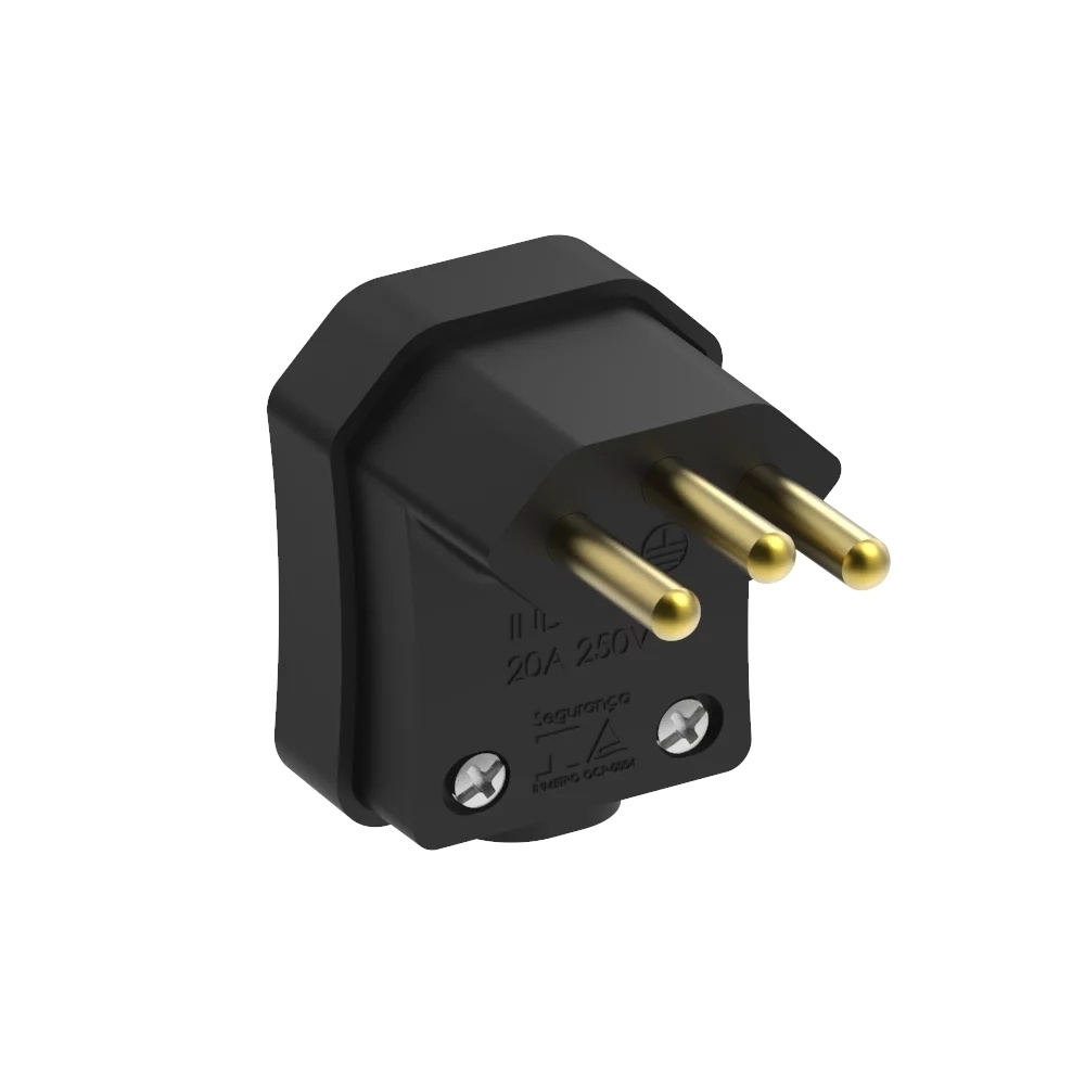Suporta corrente de até 20A e tensão de até 250Vca, estando em conformidade com as normas NBR 14136 e NBR 14936. Com acabamento preto, une robustez e praticidade em um design discreto e funcional, sendo indicado para aplicações residenciais, comerciais e industriais.