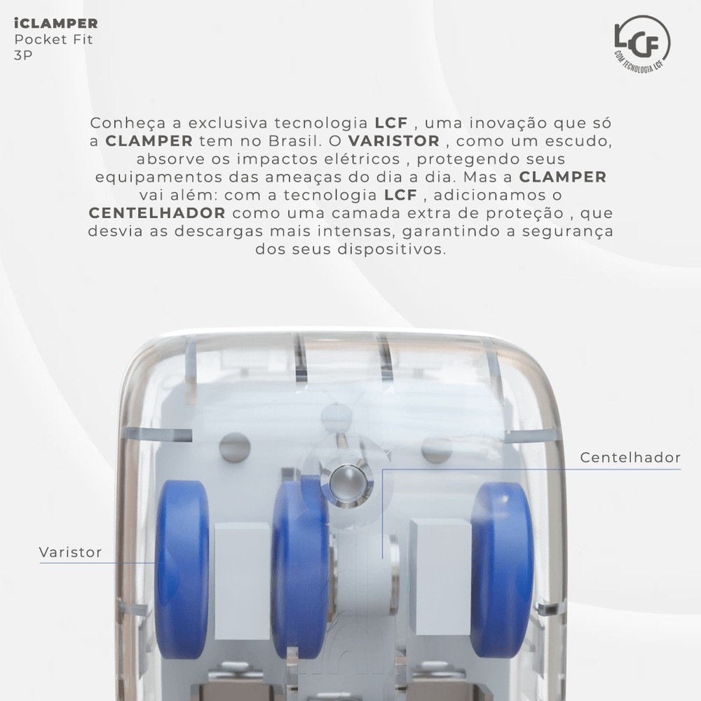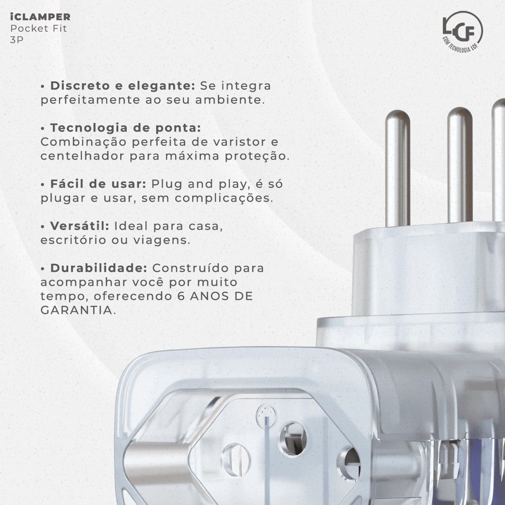 O iCLAMPER Pocket Fit 3P 10A é a solução ideal para proteger seus dispositivos eletrônicos contra surtos elétricos de forma prática, segura e discreta. Com a exclusiva tecnologia LCF, ele oferece máxima proteção e garante a longevidade dos seus equipamentos, permitindo que você aproveite total segurança e tranquilidade.