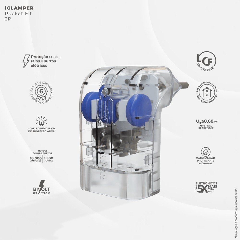 O iCLAMPER Pocket Fit 3P 10A é mais do que um dispositivo de proteção, é um investimento na segurança e durabilidade dos seus eletrônicos. Garanta a proteção de seus equipamentos contra surtos elétricos, mantendo-os seguros e prontos para uso a qualquer momento.