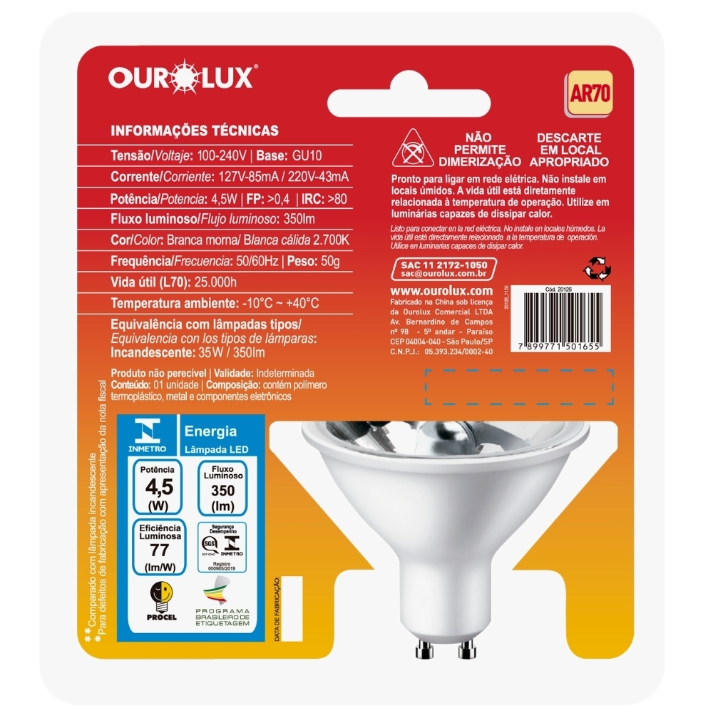 A Lâmpada LED AR70 GU10 4,5W Bivolt Luz Amarela 2700K 350LM da Ourolux é uma escolha excelente para quem busca uma iluminação focada e eficiente. Integrante da Linha Superled PAR, este modelo AR70 é especialmente indicado para uso em ambientes residenciais ou comerciais que requerem uma iluminação direcionada e de qualidade.