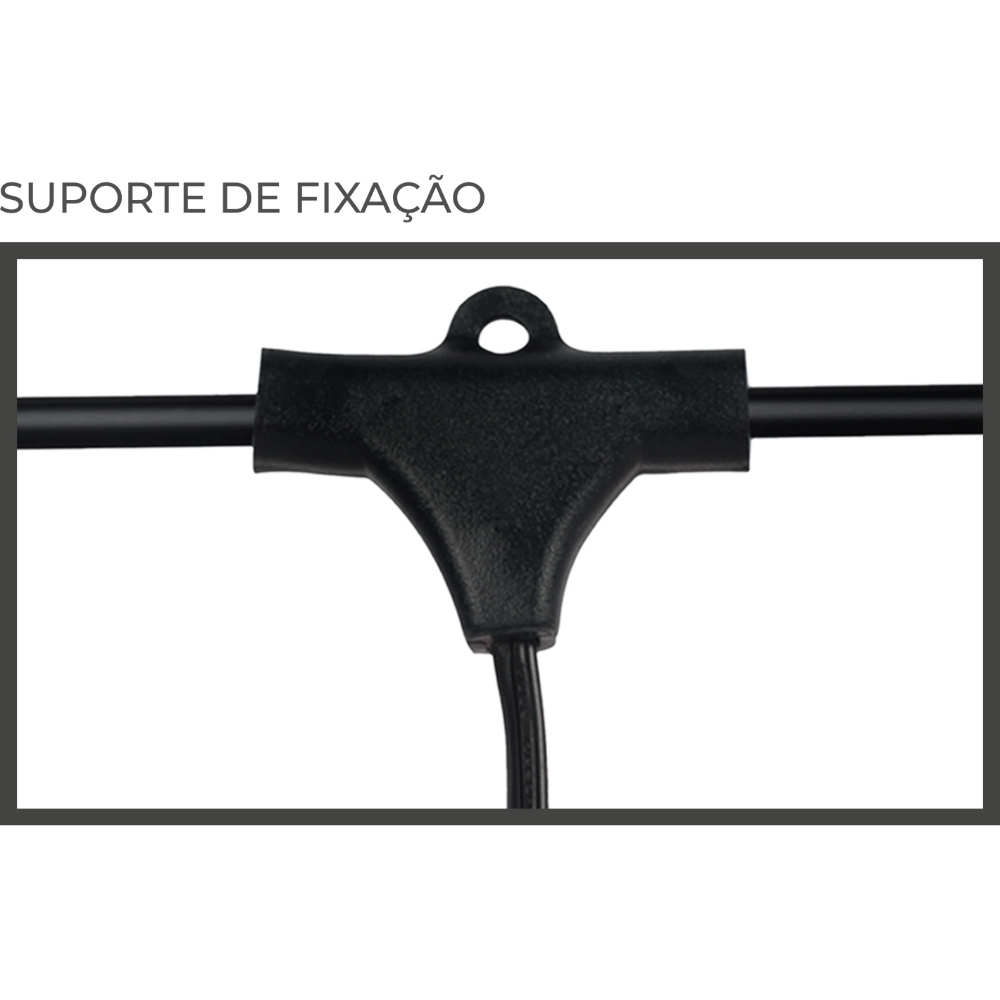 Projetado para uso externo, possui índice de proteção IP65, garantindo resistência contra poeira e jatos de água, além de conexões seguras e duráveis. Para maior flexibilidade, é possível conectar até 3 varais em sequência, alcançando 15 metros de iluminação e até 960W de potência máxima. Fácil de instalar, basta pendurar, rosquear as lâmpadas e conectar na tomada.