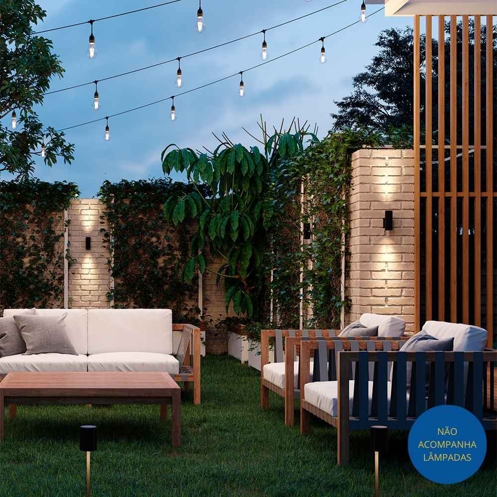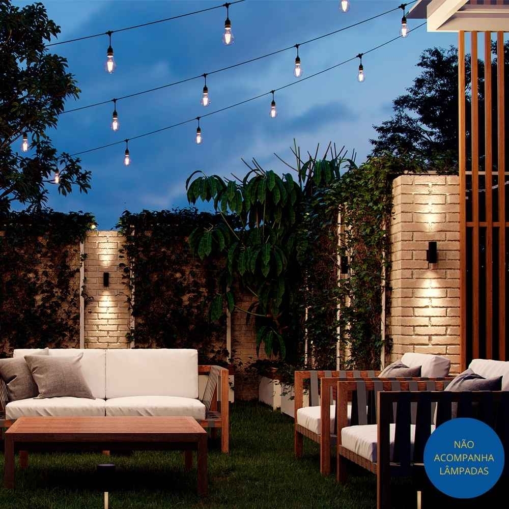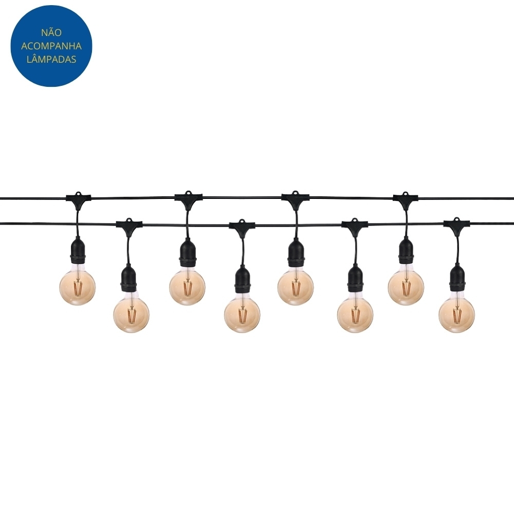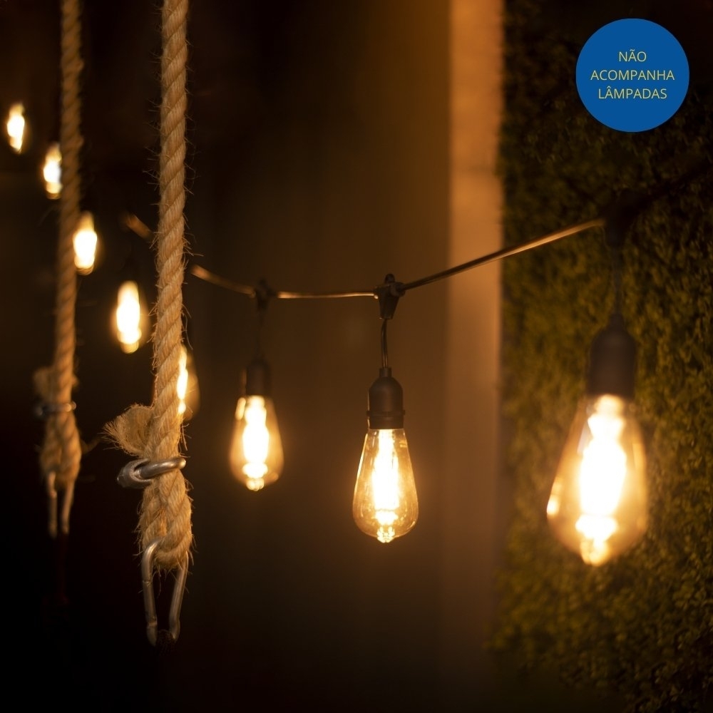Fabricado em policarbonato e PVC, o produto oferece resistência e durabilidade, além de contar com índice de proteção IP65, que garante proteção contra poeira e jatos de água. Compatível com soquetes E27, é recomendado o uso de lâmpadas de filamento LED G95 ou G125 para melhor desempenho e estética. O varal não acompanha lâmpadas nem kit de fixação.