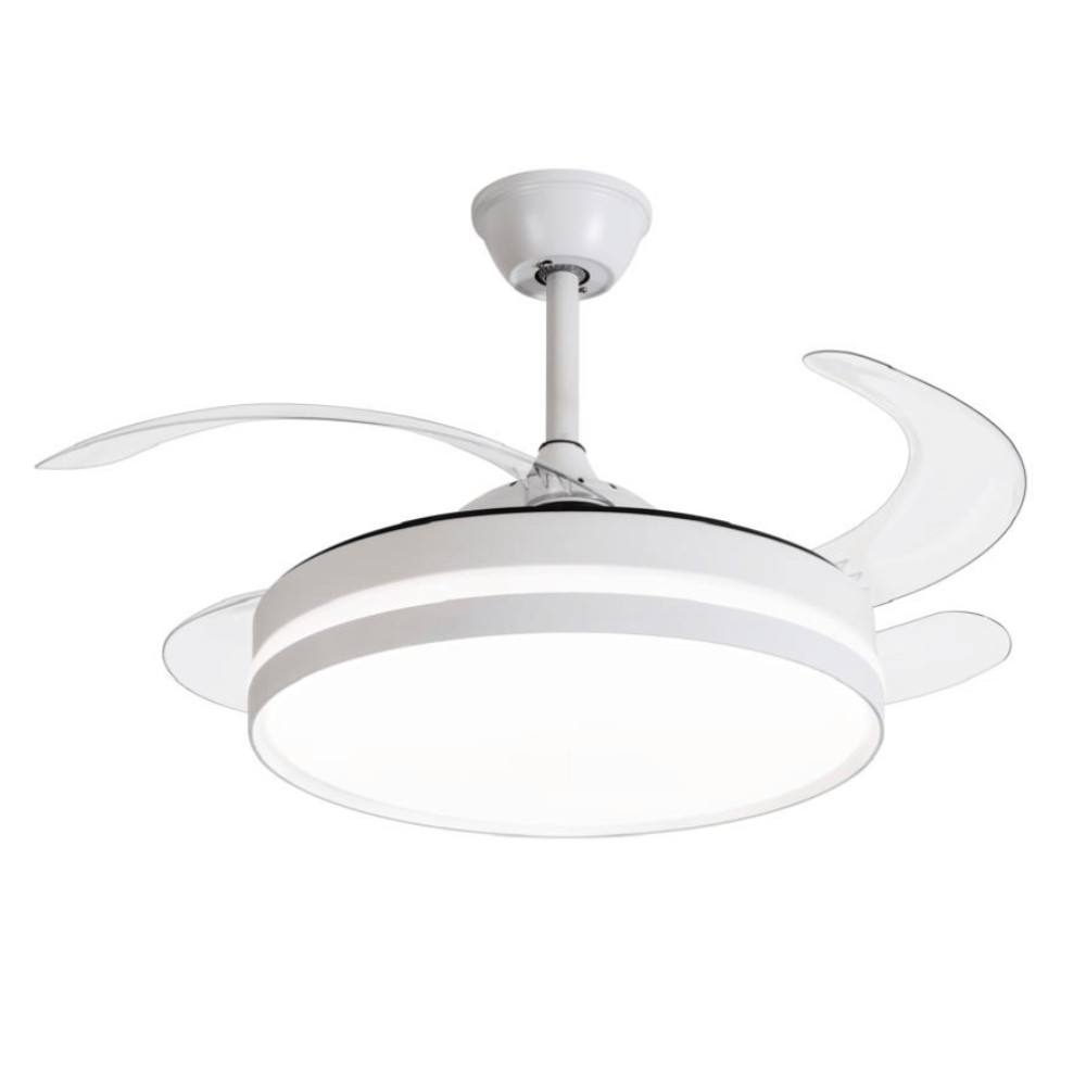 Com um design moderno em branco, que se integra facilmente a qualquer decoração, este ventilador de teto com luzes possui pás retráteis que adicionam um toque de inovação e estilo ao espaço. O ângulo de 120 graus assegura uma excelente distribuição do ar, e o Índice de Reprodução de Cor (IRC) de 80 garante uma iluminação de qualidade superior.